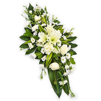 A classic white double ended spray. Featuring white Roses, Lilies, Hydrangea, Lisianthus, Chyrsanthemums and Carnations. Standard size 16" long