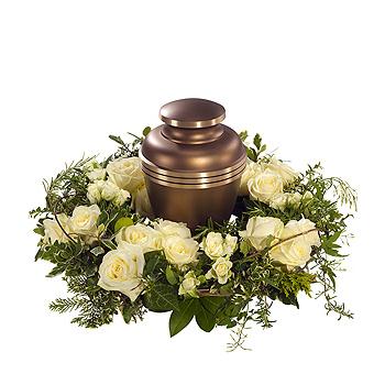 An elegant white crescent creates a beautiful focal point for an urn. White Hydrangea and Calla Lilies are the feature with spray Roses and green spray Chrysanthemums. Urn not included.