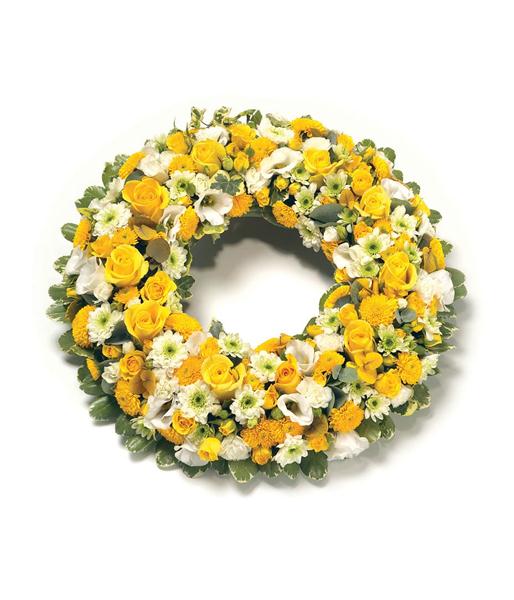 Image shows Yellow Roses, Yellow Spray Roses, Yellow Chrysanthemums, White Chrysanthemums, White Eustoma, White Spray Carnations, Eucalyptus, Pittosporum, Variegated Hedera, we will use the best flowers in season.
